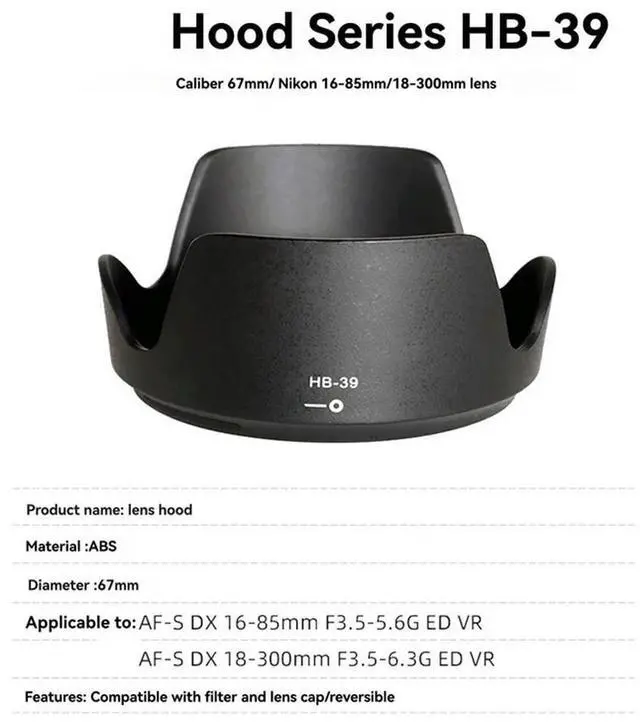 Lens Hood Replace HB-39 HB39 For AF-S 16-85Mm F3.5-5.6G ED VR AF-S 16-300Mm F3.5-6.3G ED VR