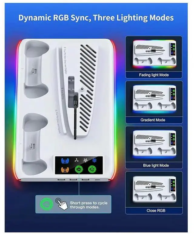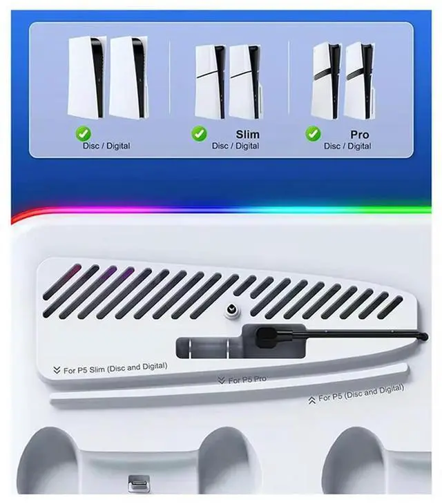 For PS5/Slim/Pro For 5 Console Cooling Stand With LED Controller Charging Station, 3-Gear Fan Included