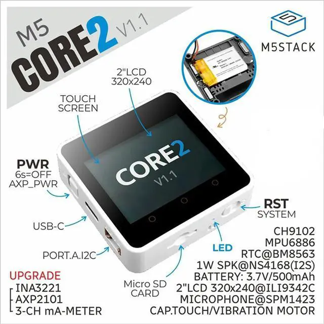 For M5stack Core2 V 1.1 ESP32 Iot Development Kit With Touch Screen, 16MB Flash 8MB PSRAM, And Graphical Programming