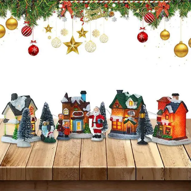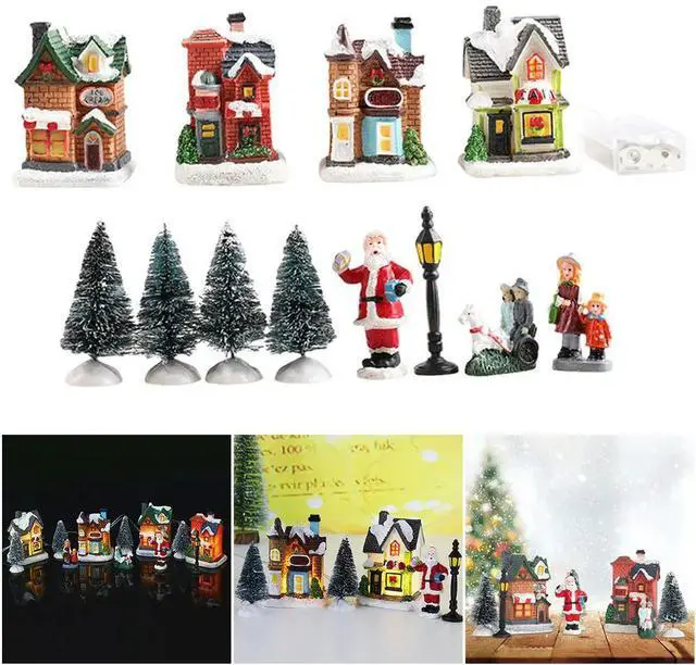 12 Pcs Mini Resin Christmas Village Figurines Decoration Set Lighted LED Christmas Winter Village Houses Xmas Winter Decorations