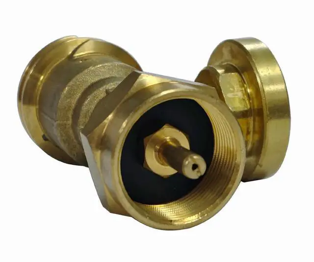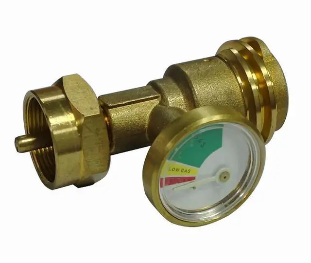 European propane adapter with pressure gauge made from brass for secure connection to gas appliances with easy hand tightening