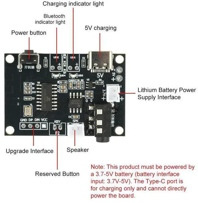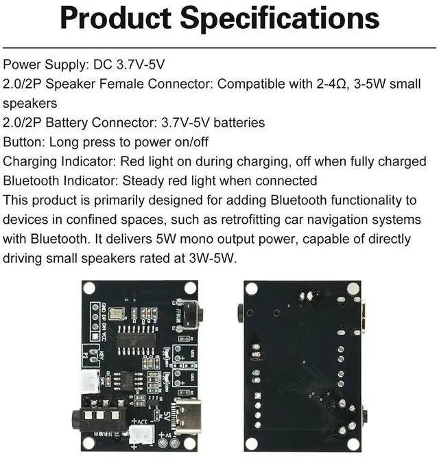 DC 5V 5W Mono Bluetooth Amplifier Board Type-C Charging Port Mini Audio Playback Module Compatible 2-4 Speaker One-Key Switch