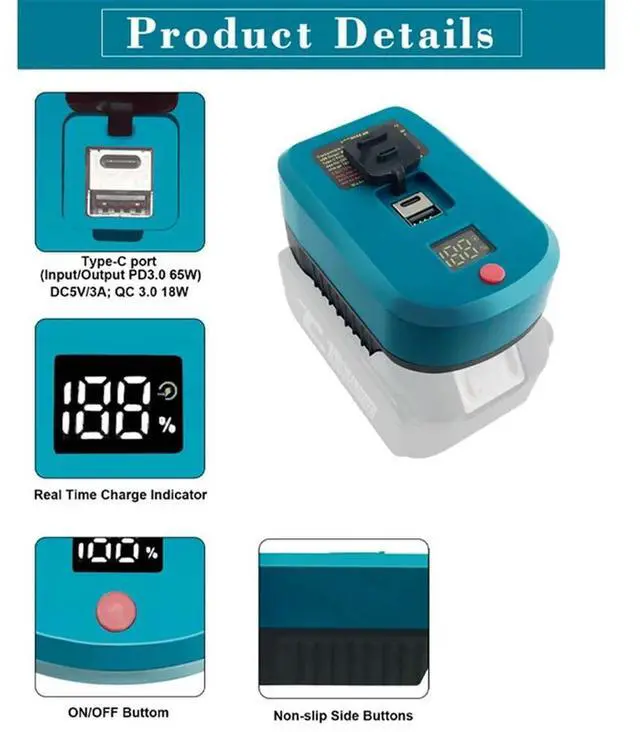65W Adapter Charger For 18V Li- With Type-C Port And USB Port Reverse USB Charge Adapter Converter Easy To Use-