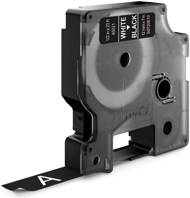 This tape compatible with Dymo 45021 1/2" White on Black D1 Tape, 23' long tape cartridge. Unique slit-back backing for easy use. Scratch and chemical resistant. Scratch and chemical resistant. Self-adhesive poly-coated DYMO D1 tape with unique easy-peel split-backing for easy use. Semi-permanent - won't leave residue behind when peeled off (on most surfaces). Both Dymo label tape color and adhesive are UV-resistant meaning label will neither darken nor fall off over time. Holds up for items in household refrigerator/freezer 1/2" (12mm) x 23 feet White on Black Label 1 label cartridge per pack