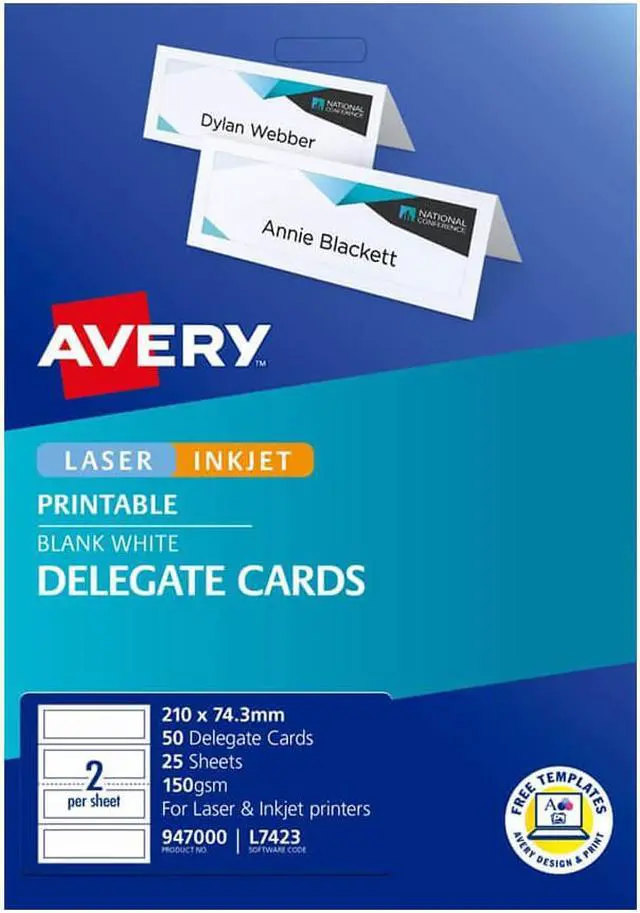 These Avery Delegate Cards are perfect for using at your next event, function, show, conference or party. You can design your cards using Avery software and print them out on your laser or inkjet printer resulting in a professional finish.