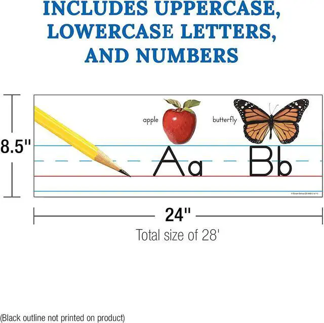 Dimensions: When fully assembled, the number and letter board pieces (24 inches x 8 1/2 inches) measures 22 feet longthe perfect size for bulletin boards, wall borders, and other visual displays.