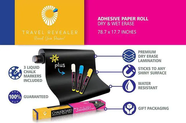 *100% satisfaction* or your money back, no questions asked! There is no risk when purchasing this premium quality chalkboard contact paper. **travel revealer is the only authorised seller of this product. Love our chalkboard contact paper roll or your money back. Simply reach out to us. Purchase our chalkboard contact paper with peace of mind now.