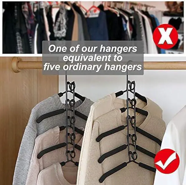 SPACE SAVING HANGER: Super space saver, Each hanger includes five separate detachable hangers, everyone can be assembled freely. Easy to hang and easy to remove. Each hanger can at least hang 5 coats or T-shirt. Work well with organizing solutions for small spaces or small apartment. Give more space in your closet, keep your closet and clothes cleanly and orderly.