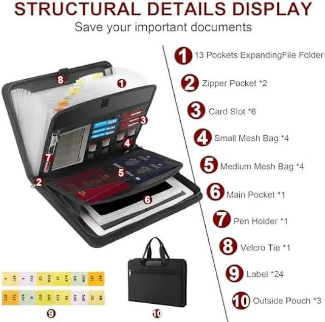Multi-Space Design: The expandable file organizer folder with 13 pockets, 2 separate layers with zippers, 4 passport-sized mesh pockets, 6 card slots, 4 USB slots, sort your stuff so you don't lose it again