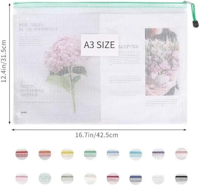 PRODUCT SIZE: The mesh zipper pouch is 16.7 x 12.4 / 42.5 cm x 31.5 cm. Larger A3 size paper. Please confirm the product size before purchase.