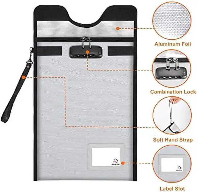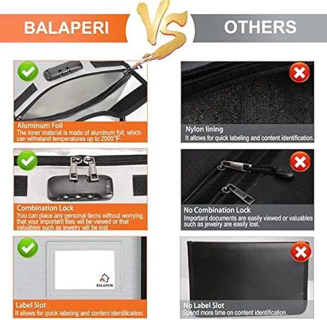 Fireproof & Water-Resistant: The outer material of BALAPERI Fireproof Document Bag is made of high-quality non-itchy silicone coated fiberglass, and the inner material is made of aluminum foil, which can withstand temperatures up to 5200 and has been passed SGS TEST (UL94 VTM-0 certification). Its also highly water-resistant, so you don't have to worry about your important documents getting wet from the rain.