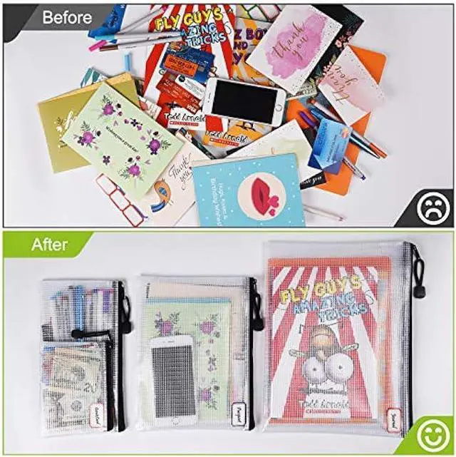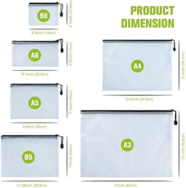 Product SizeSize of the high quality mesh document bags with Zipper are A3, A4, A5, B5, A6, B8, each size 2 pcs. Which can be used to store some office supplies, like stationery, receipts, invoices etc., also can be used for home daily storage, like the jewelry, make up brush and so on.