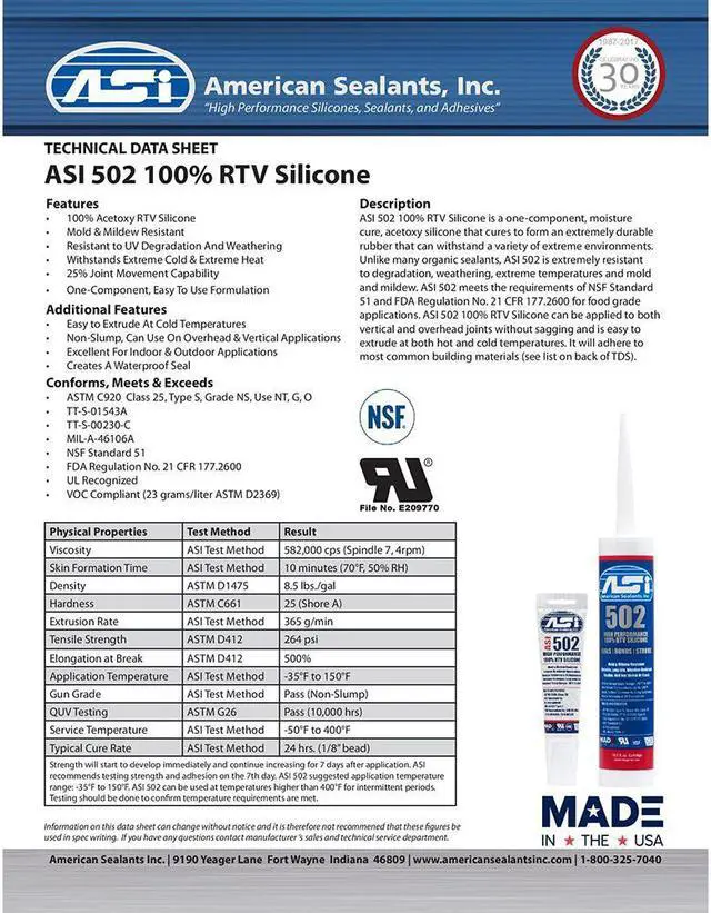 ASI 502 is a 100% RTV Silicone that is UL & NSF Recognized. ASI 502 is a one-part, moisture-curing RTV (room temperature vulcanizing) silicone that cures to a strong, silicone rubber that maintains long-term durability and flexibility. ASI 502 100% RTV Silicone is a non-slump sealant and can be applied to vertical or overhead surfaces without flowing or sagging. Because ASI 502 is a 100% RTV silicone sealant, it has excellent resistance to weathering including ozone, ultra-violet radiation, freeze-thaw conditions and airborne chemicals.