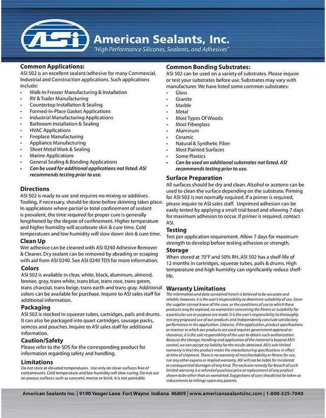 Typical Uses: ASI 502 is an excellent sealant and/or adhesive for many applications where a long-term, permanently flexible bond or seal is required.