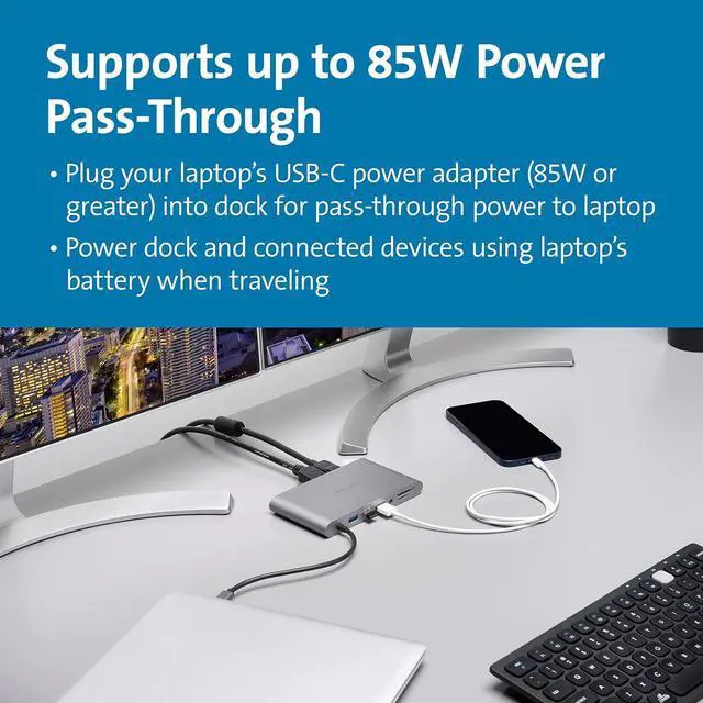 Plug your laptops USB-C power adapter (80W or greater) into the dock for pass-through power to the laptop (USB-C device must support Power Delivery), or power the dock and connected devices using the laptops battery when traveling. Optional 100W Power Adapter sold separately