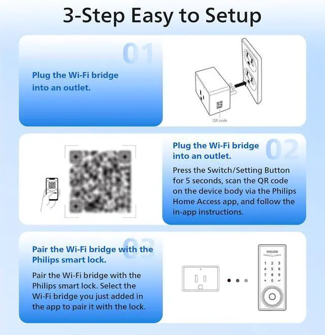 Easy to set up: just plug it in, plug and set up with your smart lock app in 2 minutes. A Philips Wi-Fi bridge can pair as many locks as you want. We recommend that the distance between the locks and the gateway is 32.5 feet for a strong connection.