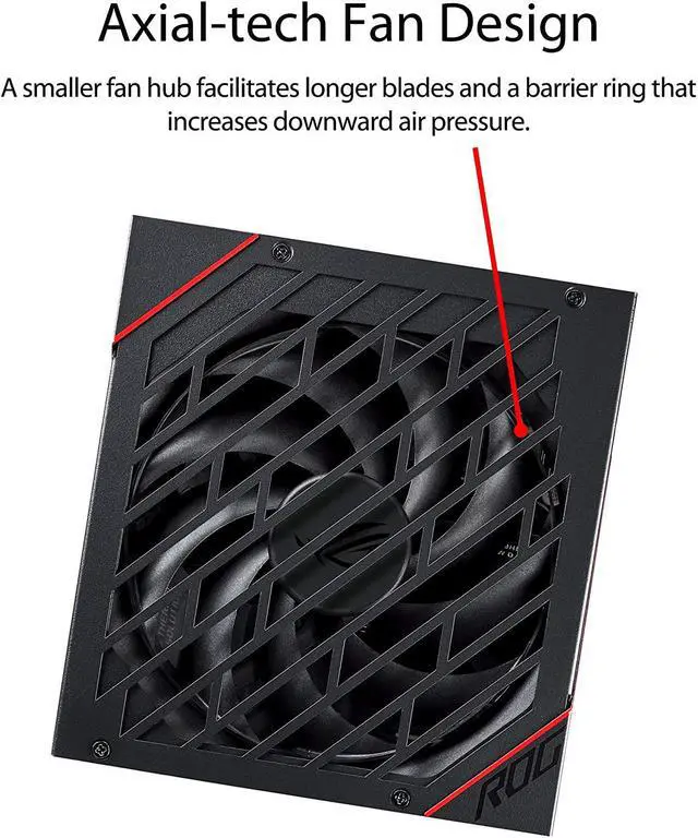 Axial-tech fan design features a smaller fan hub that facilitates longer blades and a barrier ring that increases downward air pressure.