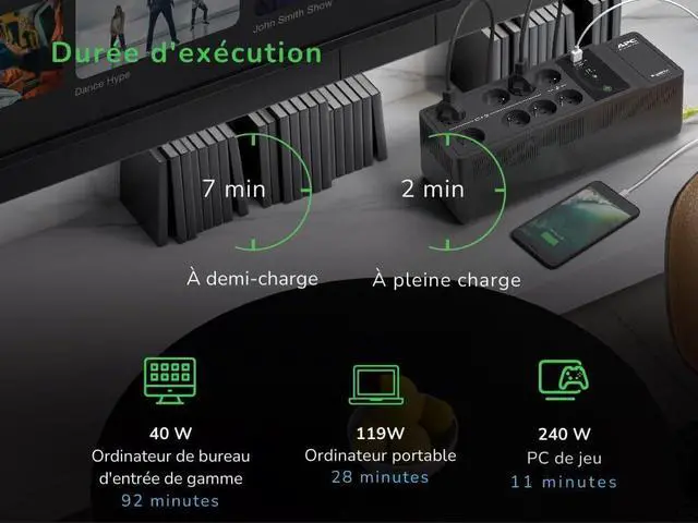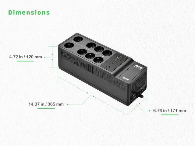 8 power outlets with battery backup and surge protection, as well as 2 USB charging ports (Type A and C) to easily charge your mobile devices
