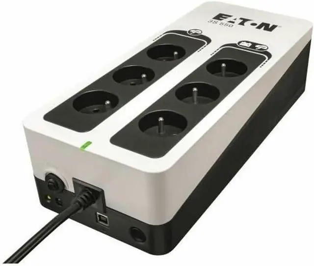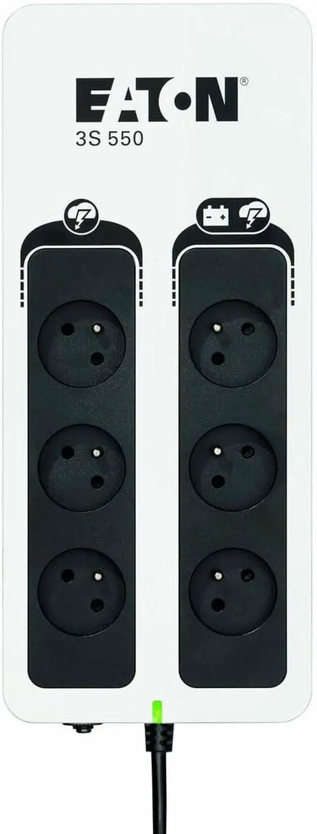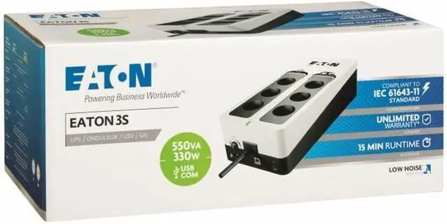 3S 550 VA /330 W. 6 FR output outlets: 3 surge protection outlets +emergency battery, 3 surge protection outlets only Fanless, no noise (except alarm tone in case of events) UPS with USB interface (USB cable and software included)