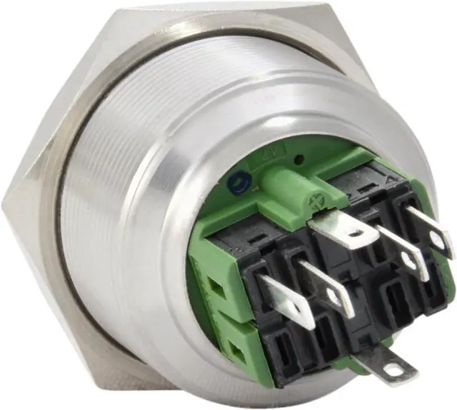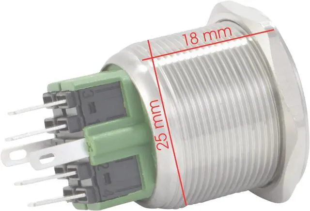 Operation Type: Momentary (push the button, ON; release it, OFF), Max Switch Rating: 250V AC/DC 5A, LED rating: 12V DC 15mA, Panel Cutout Diameter: 1" (25mm)