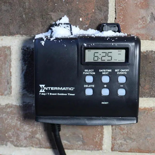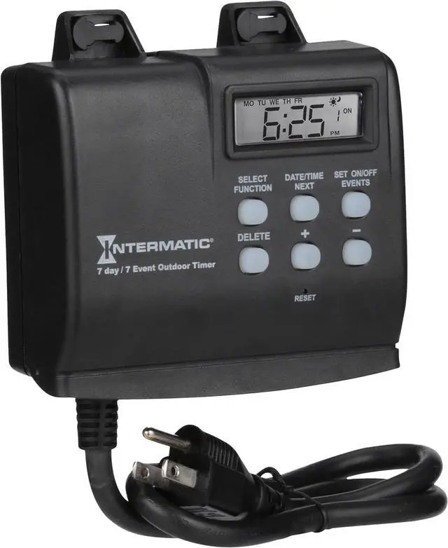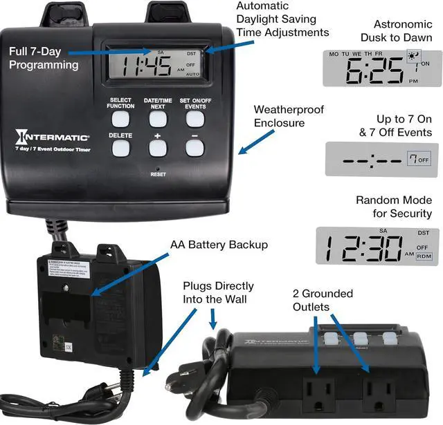 FULL FEATURE OUTDOOR TIMER - Weatherproof enclosure with 7-day programming and 14 ON/OFF events for versatile control of lights, decorations, pumps, or fans.
