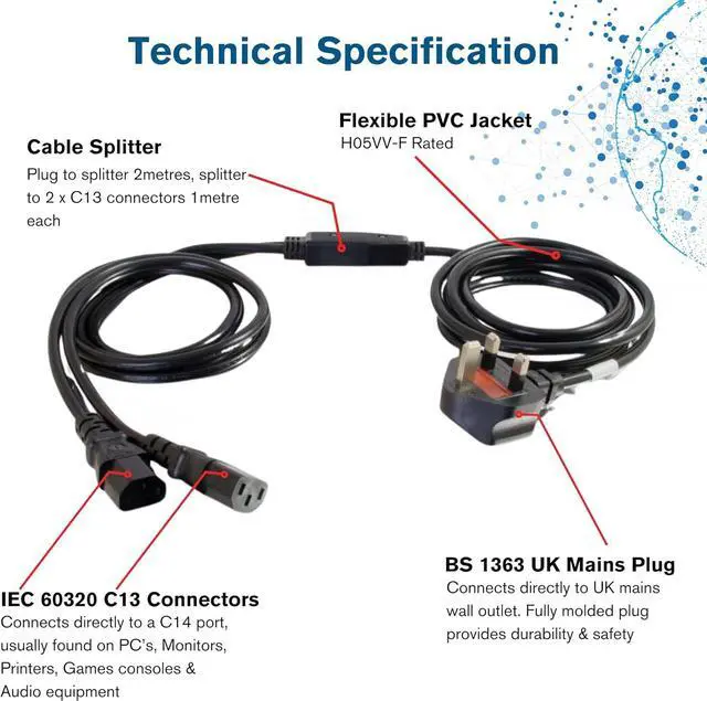 C2G Cbl/3m BS 1363 to 2x C13 Y-Cable. Cable length: 3 m Connector gender: Male connector / Male connector Connector 1: BS 1363. Input voltage: 250 V Input current: 13 A. Cable colour: Black