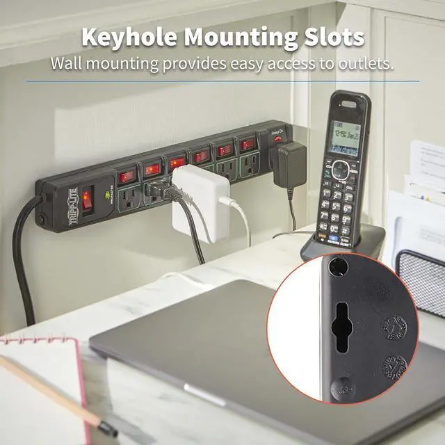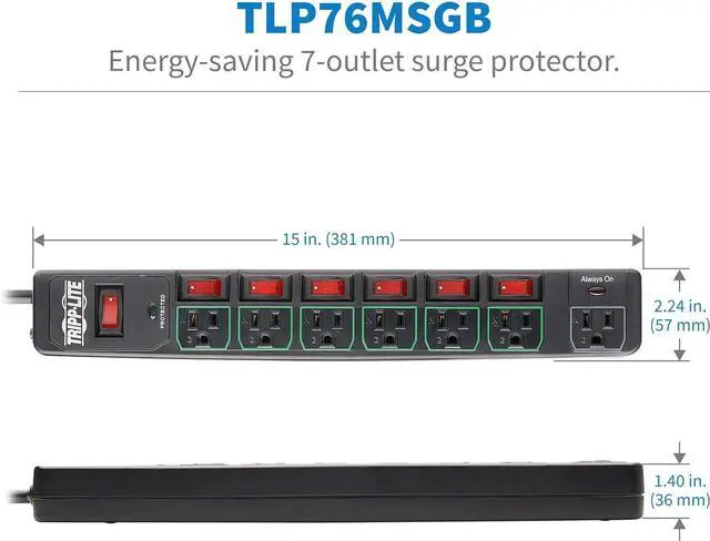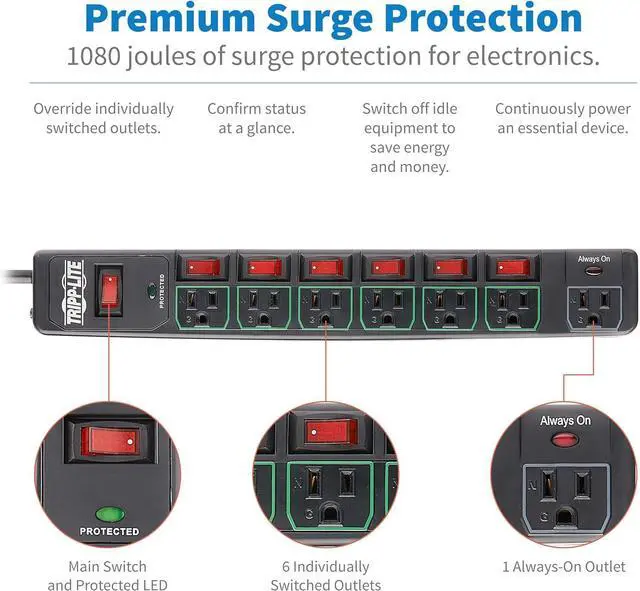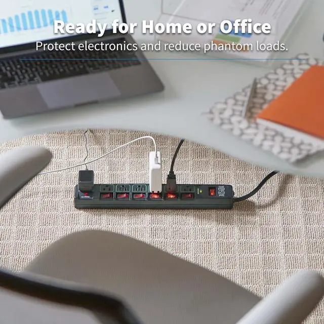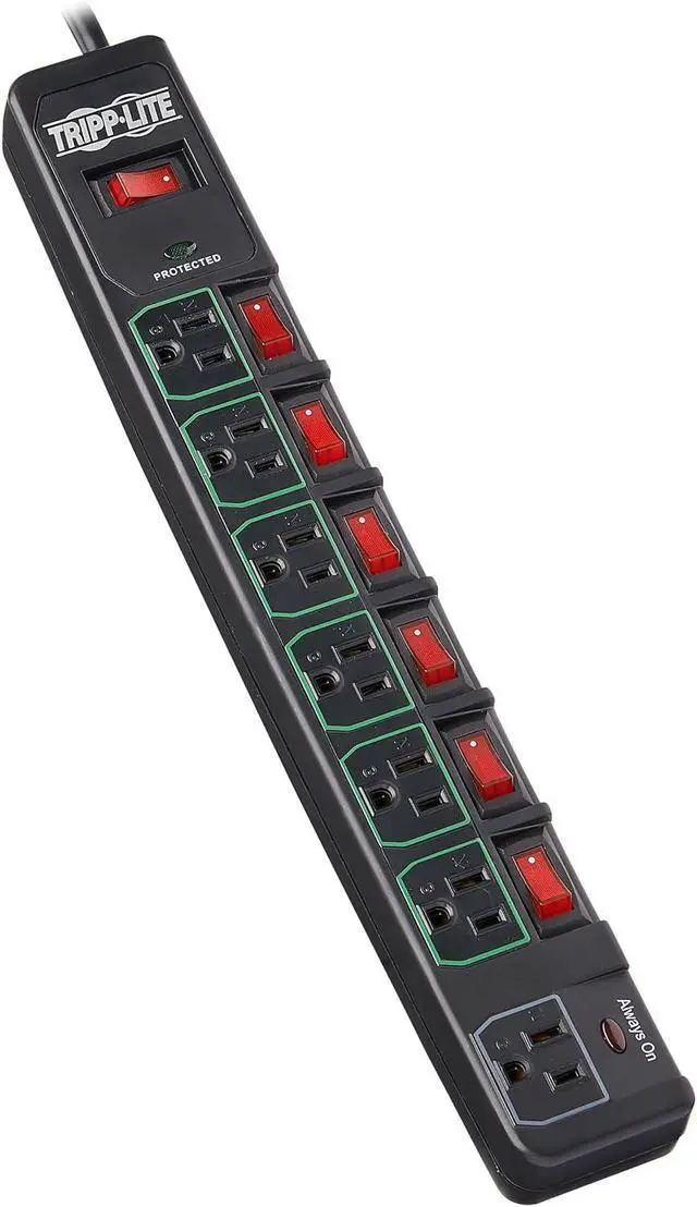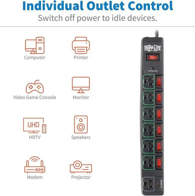 ECO SURGE PROTECTION WITH INDIVIDUAL OUTLET SWITCHES: This surge suppressor includes 7 total outlets - six 5-15R outlets that have individual on/off switches