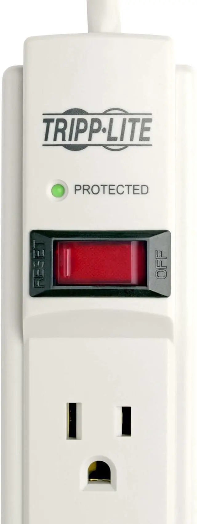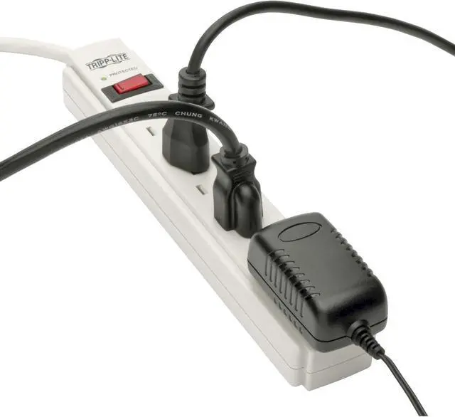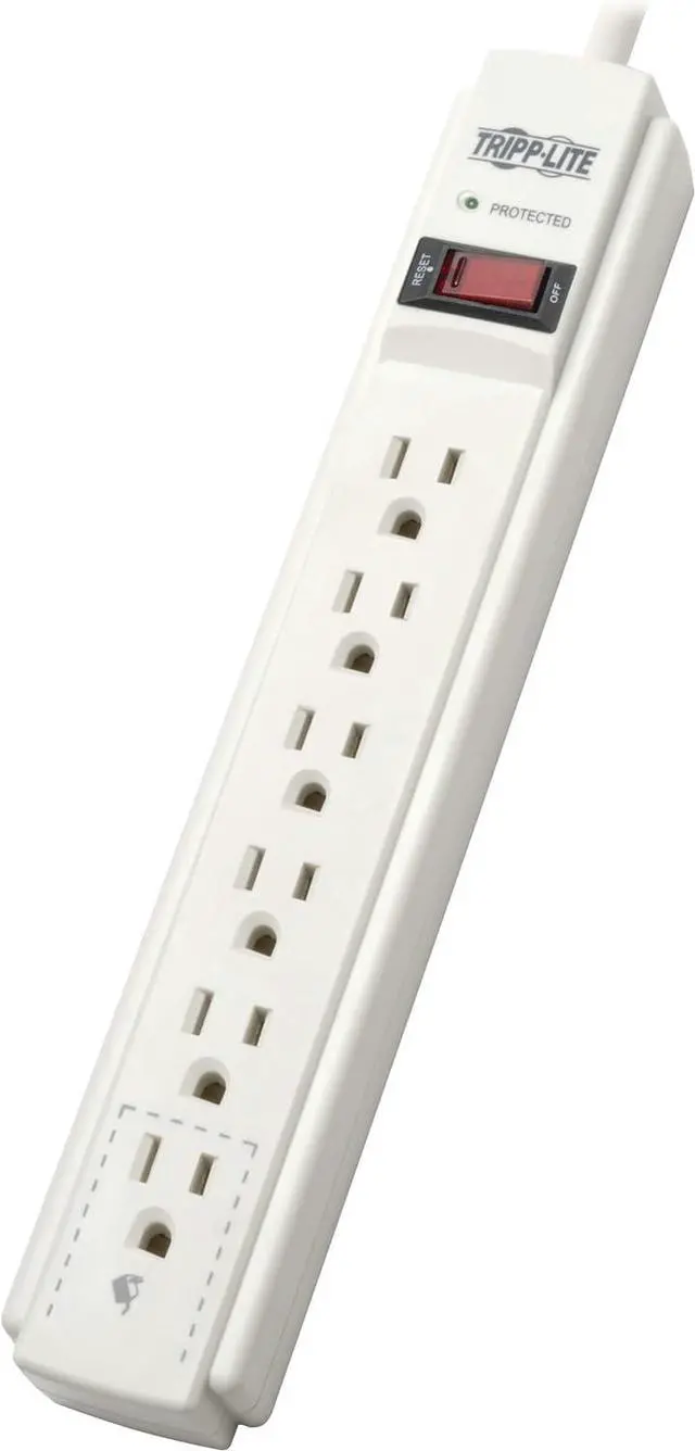 6-OUTLET ECONOMICAL AC SURGE PROTECTION: This surge suppressor provides six total NEMA 5-15R outlets, one of which is placed at the end to accept a bulky transformer without blocking adjacent outlets. White surge protector with 6 ft. AC power cord with NEMA 5-15P plug provides to ability to reach distant outlets.