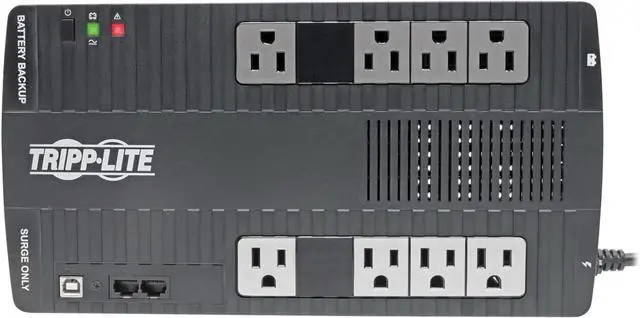 NEMA 5-15P input plug and 8 NEMA 5-15R outlets (4 battery supported outlets, 4 surge-only outlets)