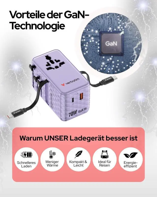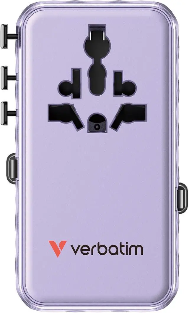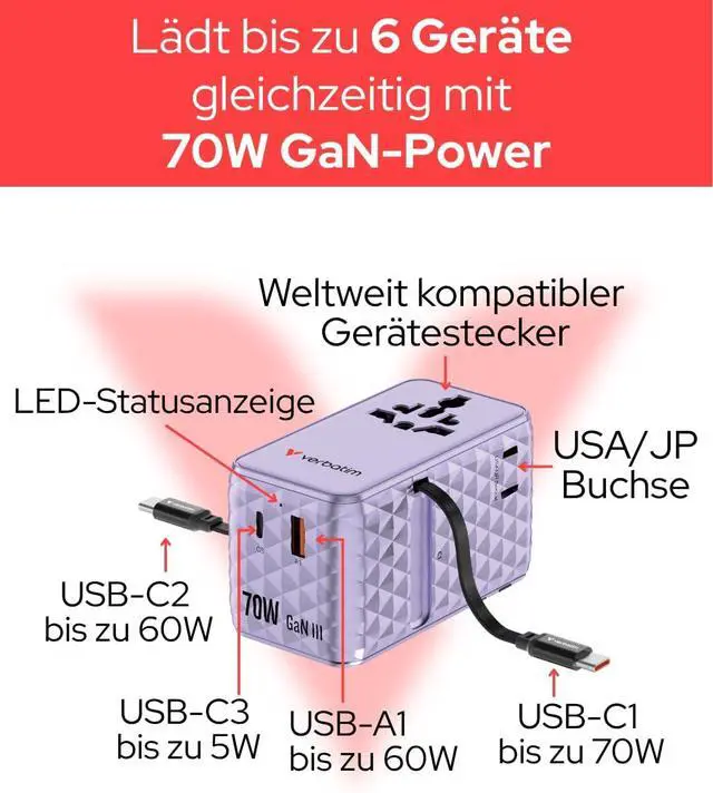 Box contents: 1 x 70W GaN-III universal travel adapter with USB-C, USB-A and 2 x USA/JP ports and 2 x Verbatim built-in retractable USB C cables, including spare fuse, quick instructions and travel case, purple. [No sale/shipping to Switzerland]