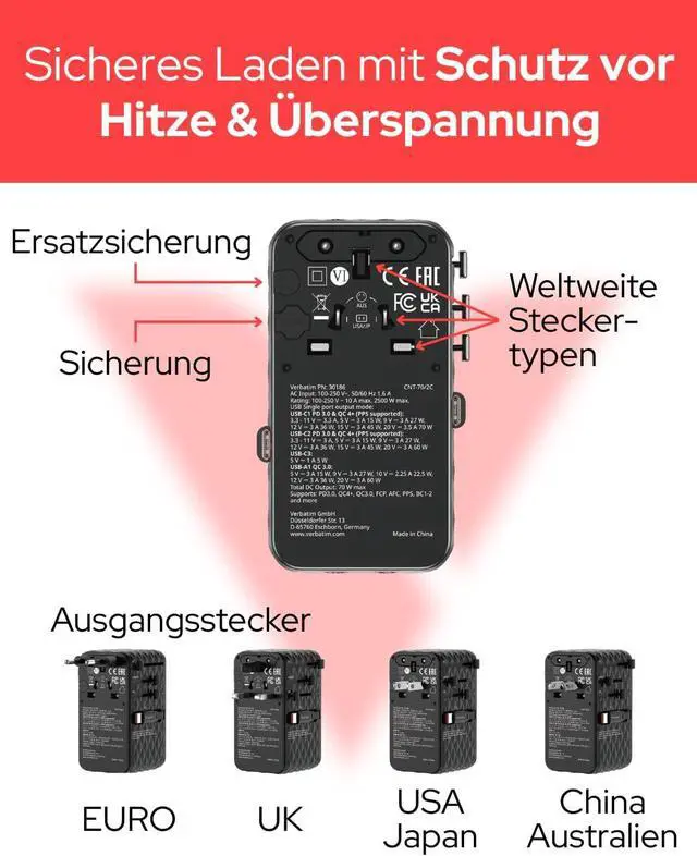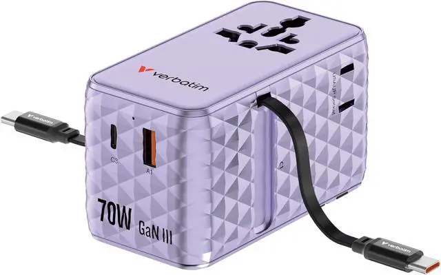 • Box contents: 1 x 70W GaN-III universal travel adapter with USB-C, USB-A and 2 x USA/JP ports and 2 x Verbatim built-in retractable USB C cables, including spare fuse, quick instructions and travel case, purple. [No sale/shipping to Switzerland]