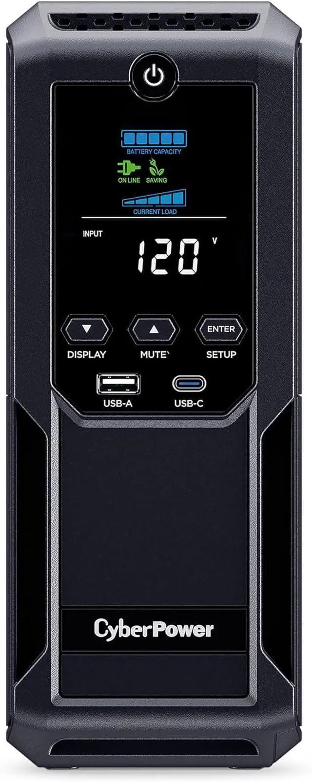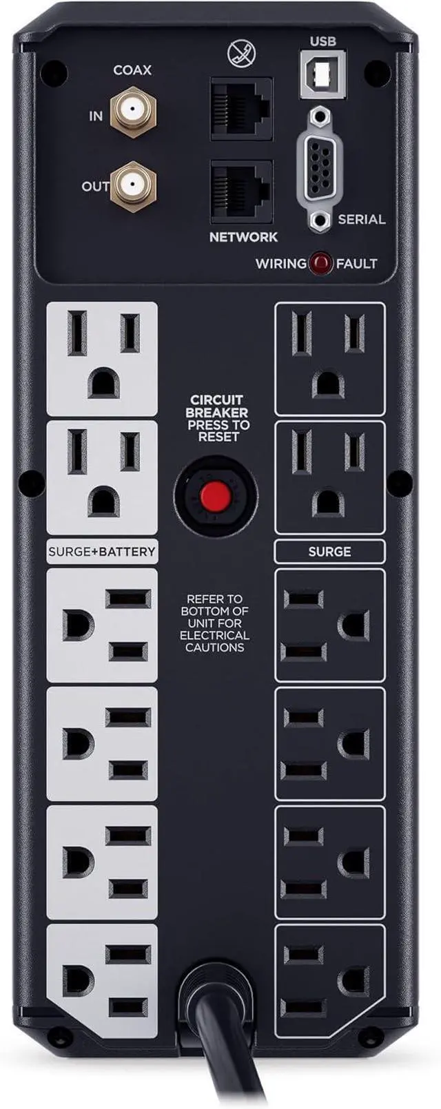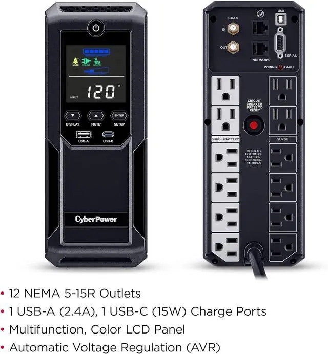 12 NEMA 5-15R OUTLETS: Six battery backup & surge protected outlets; six surge protected outlets; INPUT: NEMA 5-15P plug with 6-foot power cord; USB charge ports (1 Type-A, 1 Type-C) quickly charge mobile phones and tablets