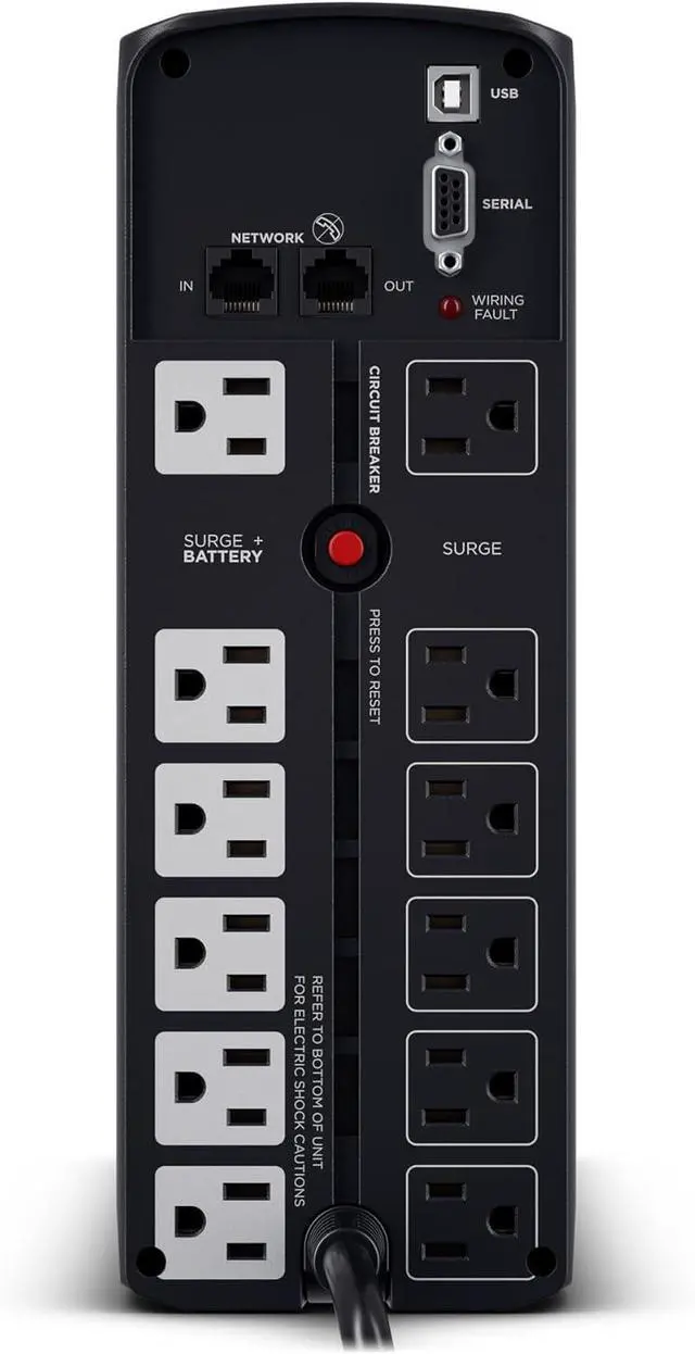 12 NEMA 5-15R OUTLETS: Six battery backup & surge protected outlets; Six surge protected outlets; INPUT: NEMA 5-15P right angle, 45 degree offset plug with five foot power cord
