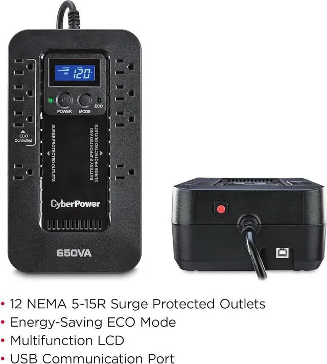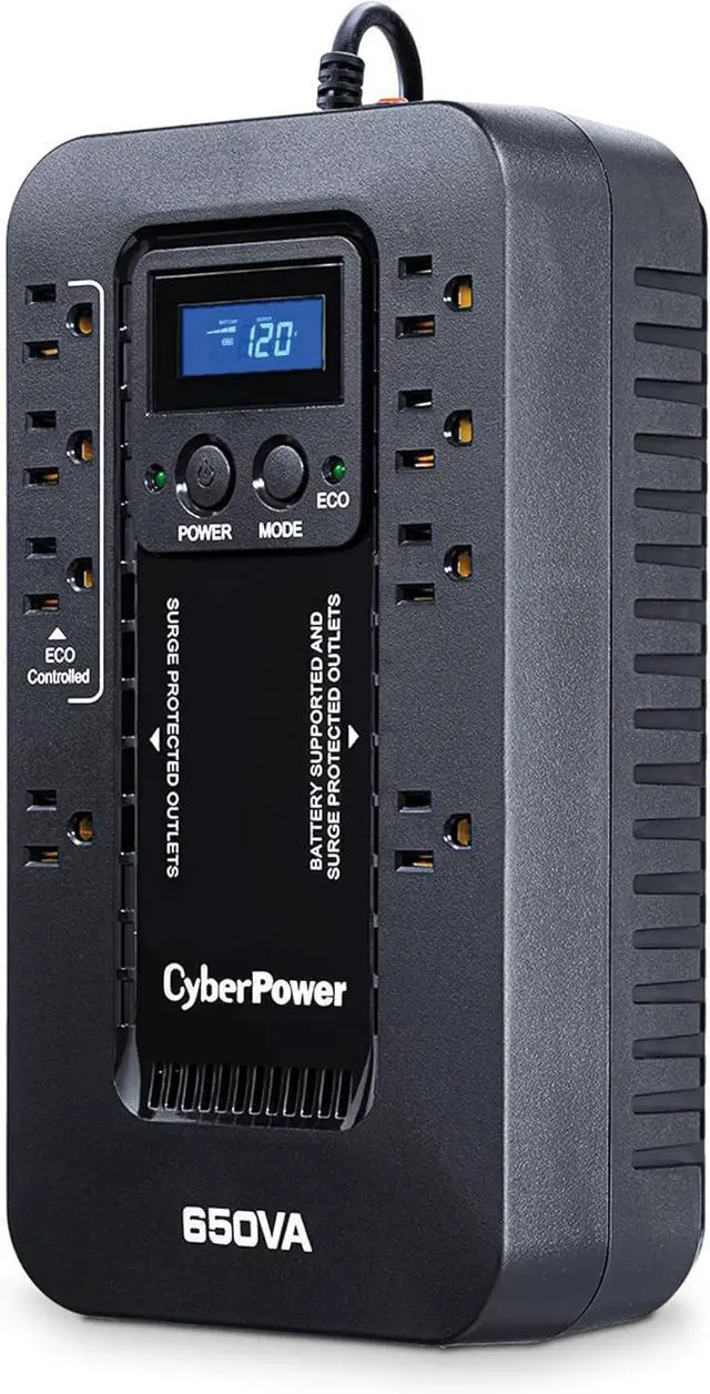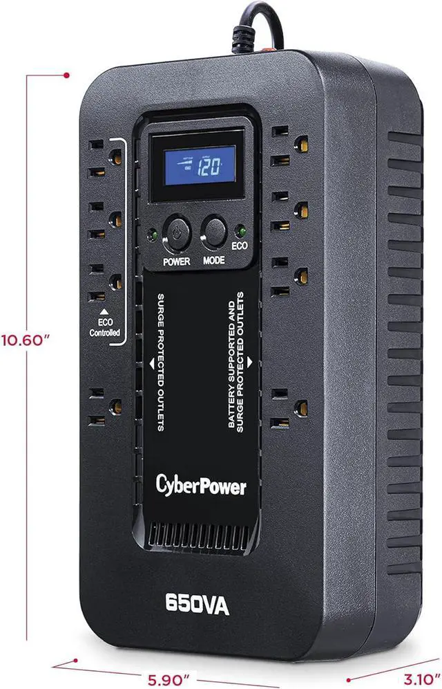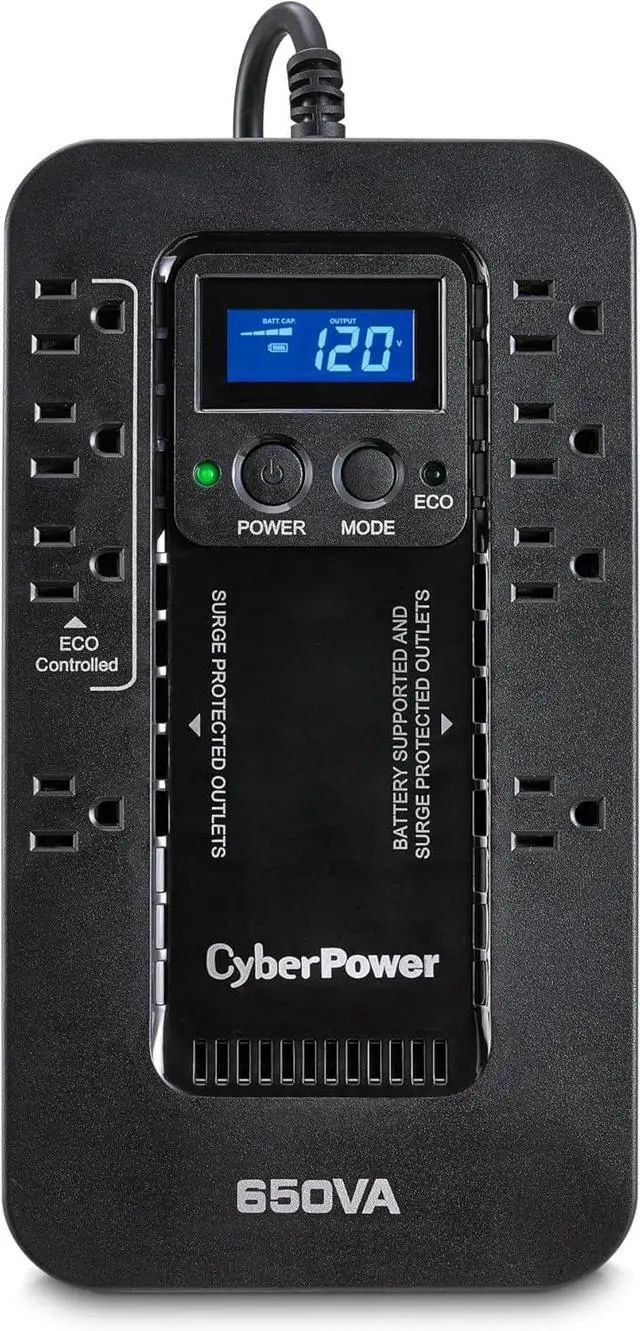 650VA/390W Ecologic Battery Backup Uninterruptible Power Supply (UPS) System uses simulated sine wave output to safeguard workstations, networking devices, and home entertainment equipment