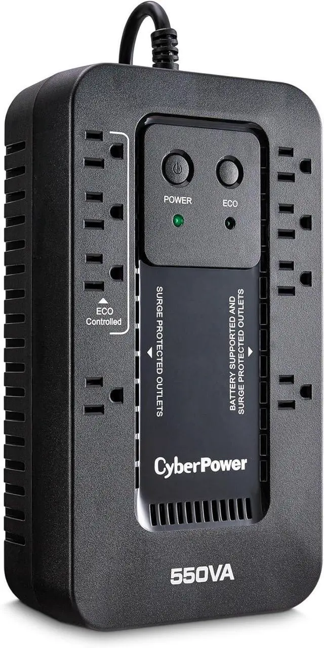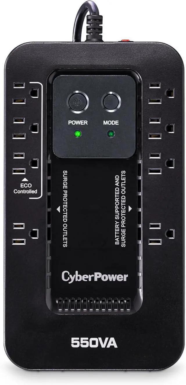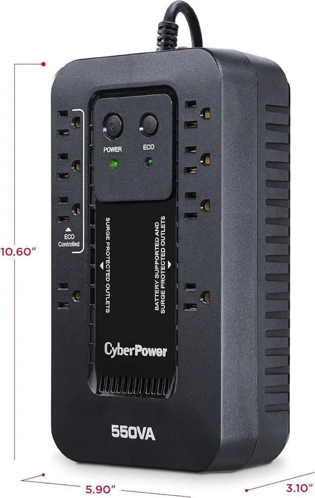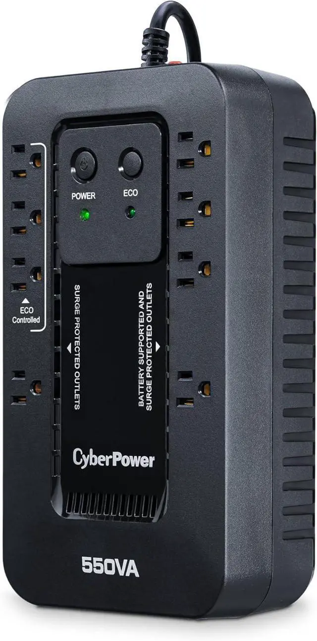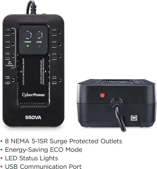 550VA/330W Ecologic Battery Backup Uninterruptible Power Supply (UPS) System uses simulated sine wave output to safeguard workstations, networking devices, and home entertainment equipment