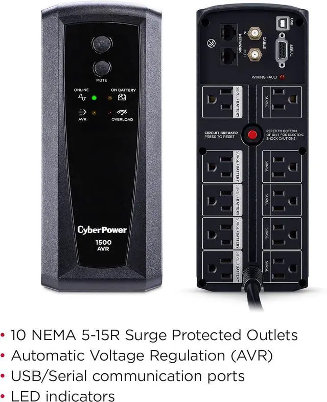 1500VA/900W AVR Battery Backup Uninterruptible Power Supply (UPS) System uses simulated sine wave technology to safeguard desktop computers, workstations, networking devices, and home entertainment equipment