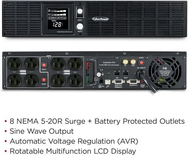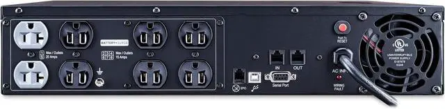 EIGHT BATTERY BACKUP & SURGE PROTECTED OUTLETS: Two NEMA 5-20R outlets, Six NEMA 5-15R outlets; INPUT: NEMA 5-20P right angle, 45 degree offset plug with 10 foot power cord