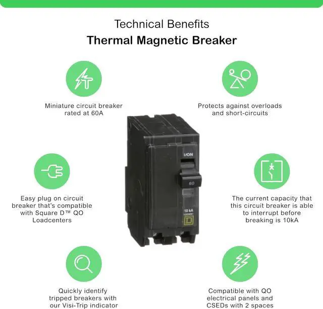 • HIGH CAPACITY: With a 60A rating at 120/240VAC & a 10kA breaking capacity, this 2-pole QO circuit breaker offers protection from overcurrents, ensuring safety of equipment & personnel.