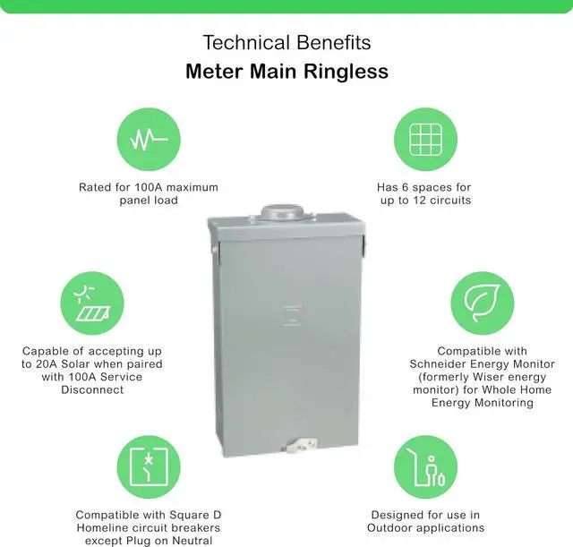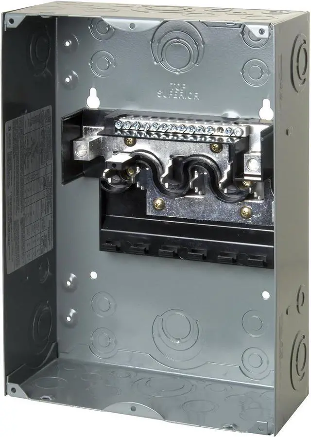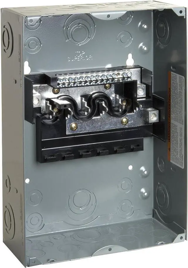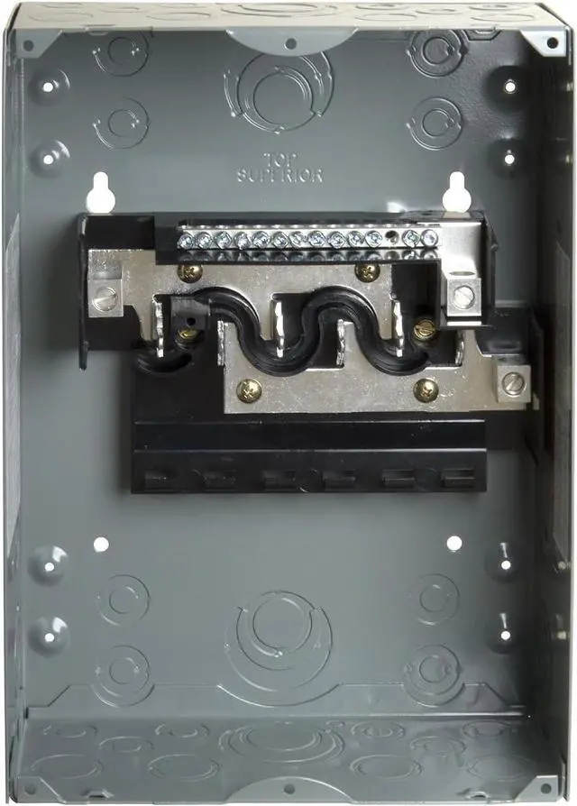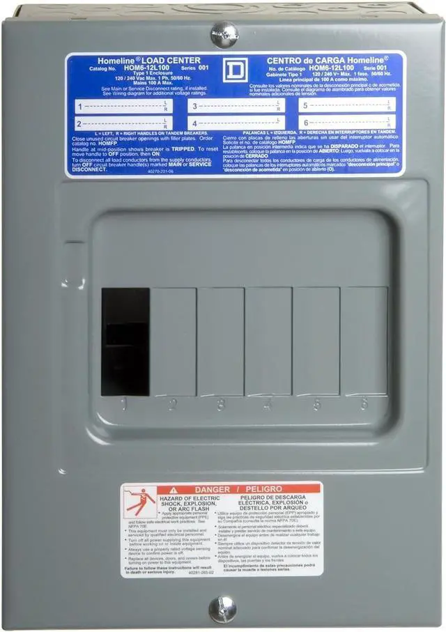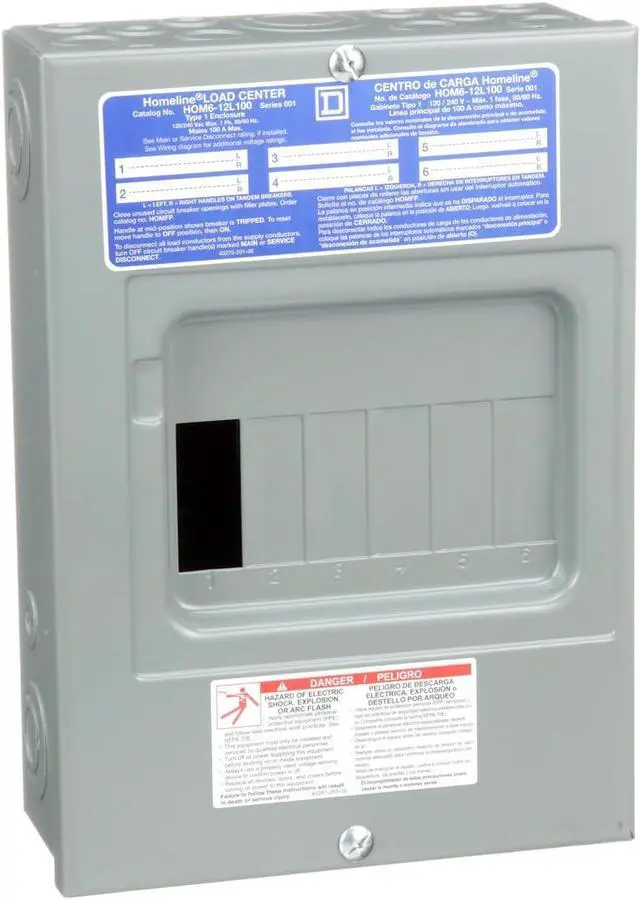 Engineered for value, Homeline Plug-on Neutral Loadcentres are designed for fast installation, reliability, and superior circuit protection. This load center has main lugs rated at 100A single phase with 12 circuits. It provides a 10kA breaking capacity. The box lugs will accept a wire range of 8 AWG to 1 AWG copper or aluminum wire. Homeline load centers feature 3 main cable entry knockouts on the top end wall as well as additional backwall knockouts for installation flexibility. This load center also includes elongated sidewall mounting holes for flush adjustment and quick installation. Offered in a white surface color to match at home appliances, This electrical system provides 6 spaces in a NEMA 1 enclosure for indoor protection. A grounding bar is included but not installed. Homeline load centers are CSA certified.