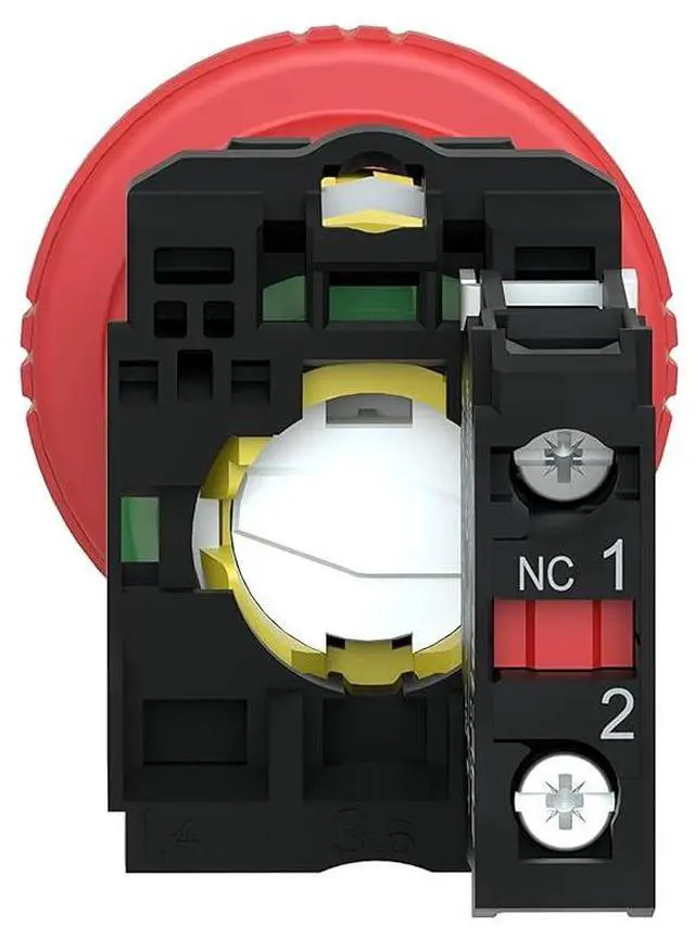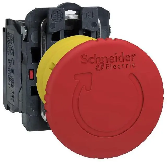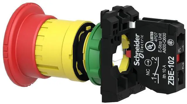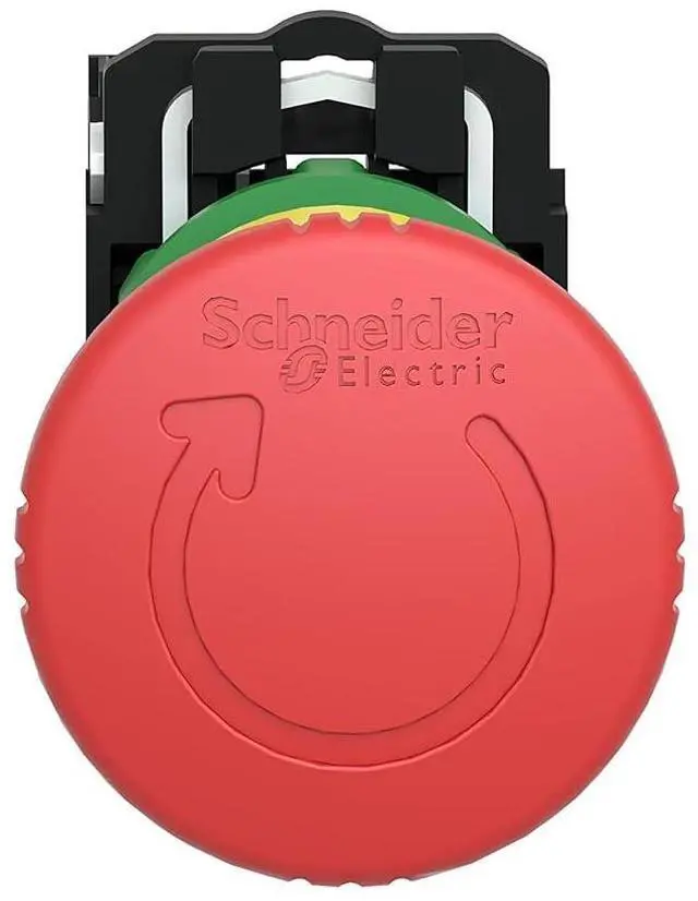 STOP EMERGENCIES FAST: The Harmony XB5 emergency stop mushroom head modular push button operates with a latched-turn-to-release mechanism. It has a plastic bezel and is supplied with a red mushroom diameter 40 mm, unmarked. This pushbutton makes a valuable addition to the control interface of any machine given its ergonomic design and easy visibility.