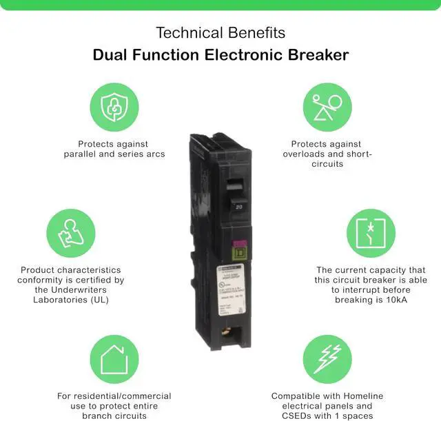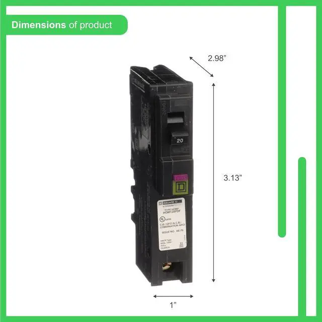 Homeline 20 Amp single-pole plug-on-neutral dual function (CAFCI and GFCI) circuit breaker^Innovative neutral connection design leads to fewer connections and faster installation, no pigtails which frees up gutter space^Compatible with Homeline series 4 and newer load centers only^Rated for 120 VAC^Rated for 10,000 AIR