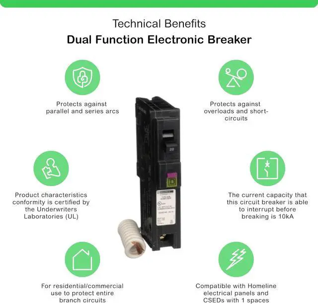INNOVATIVE PROTECTION: Homeline Dual Function Circuit Breakers save space and installation time while meeting all code requirements; These circuit breakers combine two state-of-the-art technologies CAFI and GFCI (class A) protection into one device