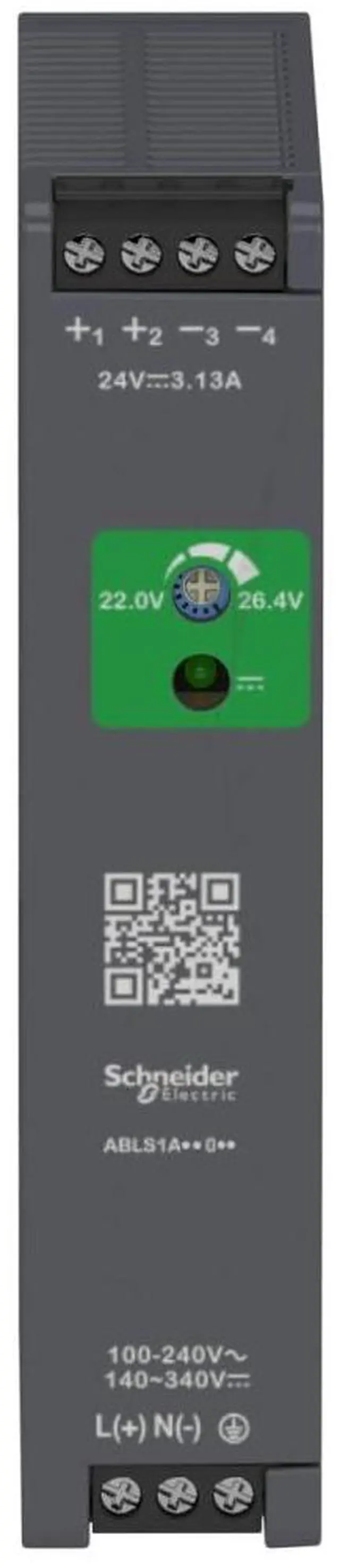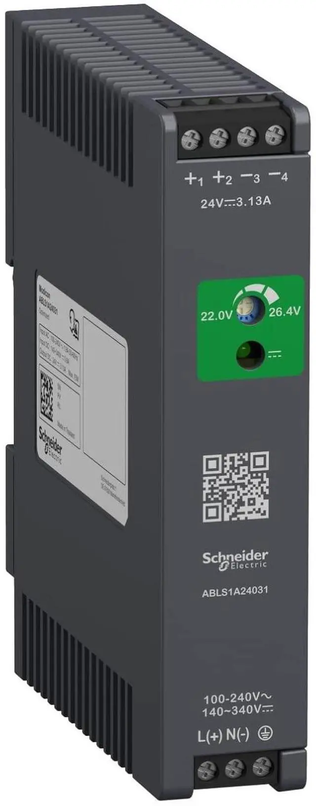 Schneider Electric Modicon Optimized Single-Phase Regulated Power Supply for Automated Systems, 100-240V AC, Rated 24V/3.1A, Plastic, Integrated Overload and Short-Circuit Protection (ABLS1A24031-FBA)