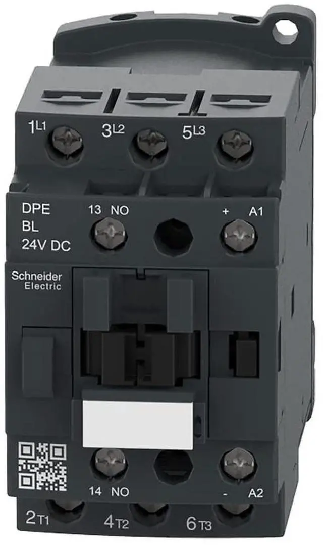 EASY TESYS CONTACTOR: The Easy TeSys DPE IEC contactor has 3 poles (3NO), and is for use in motor control applications up to 18A/690V AC-3 (7.5 HP@480V). It provides a 24V DC coil, 1NO+1NC built-in auxiliary contacts (NC mirror certified), and connection by screw clamp terminals.