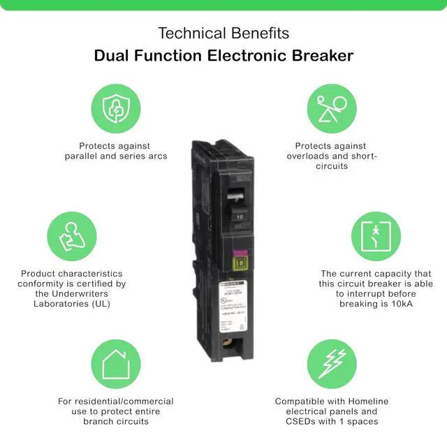 DUAL FUNCTION: These Homeline circuit breakers combine arc fault and ground fault circuit interrupters, providing overload and short circuit protection in a single device.