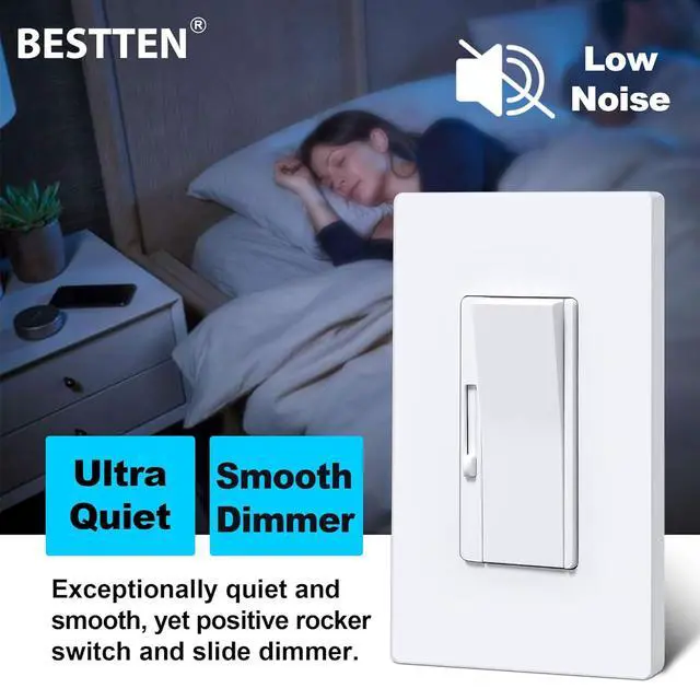 Exceptionally quiet and smooth, yet positive rocker switch and slide dimmer. Matching screwless wallplates included