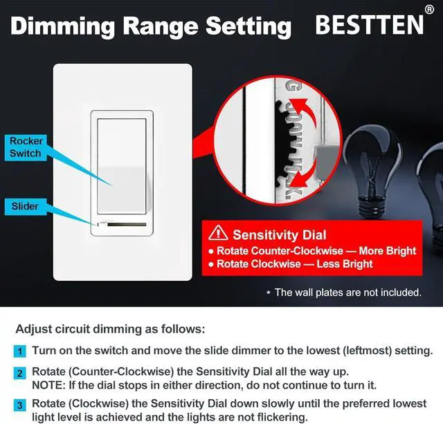 Adjuster Dial: Ensures compatibility for almost all dimmable LED, CFL, and incandescent or halogen bulbs, up to 150 watts of dimmable LED/CFL lamps or 600 watts of incandescent bulbs. Min. Load for LED lights: 3W