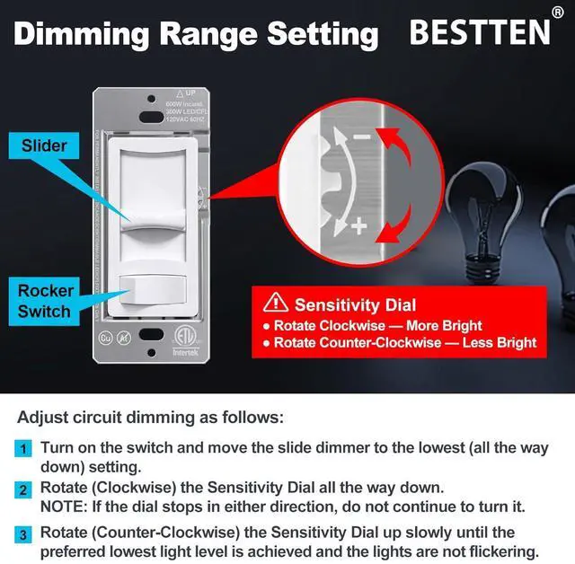 Widest LED bulb compatibility range available using advanced dimmer technology developed specifically for dimmable LED bulbs. Also works with incandescent or halogen bulbs. Please rotate the SIDE ADJUSTMENT WHEEL to eliminate flicker issues