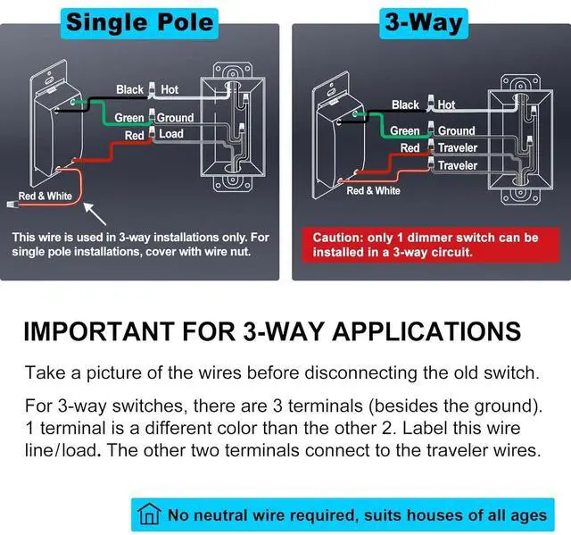 For single pole and 3 way applications. No neutral wire required