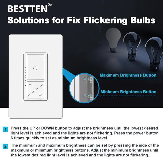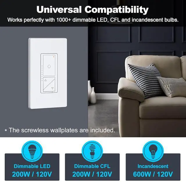 Ensures compatibility with almost all DIMMABLE LED, CFL, incandescent and halogen bulbs, up to 300 watts of dimmable LED/CFL lamps or 600 watts of incandescent bulbs